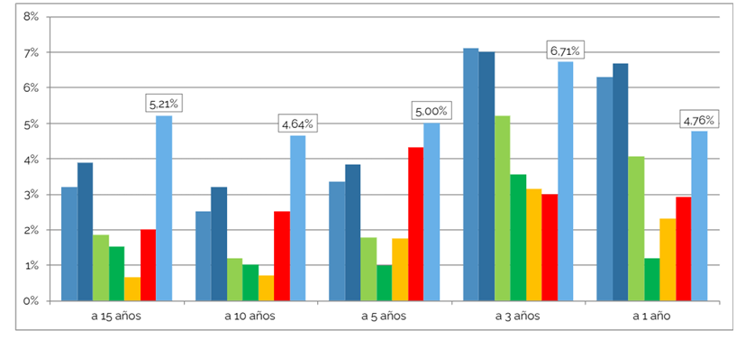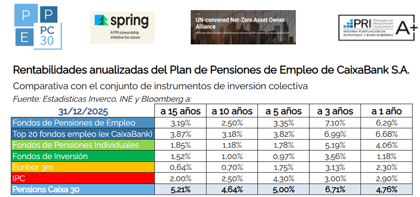 En este contexto, el Plan de Pensiones de Empleo PC30 cierra el año con una rentabilidad del 4,76 % a un año, confirmando un comportamiento sólido y coherente con su perfil de riesgo. Más allá del dato anual, el cuarto trimestre refuerza el posicionamiento estructural del fondo, con rentabilidades anualizadas del 5,00 % a cinco años, 4,64 % a diez años y 5,21 % a quince años, claramente por encima del IPC, del Euríbor y de la media de los fondos de pensiones de empleo.